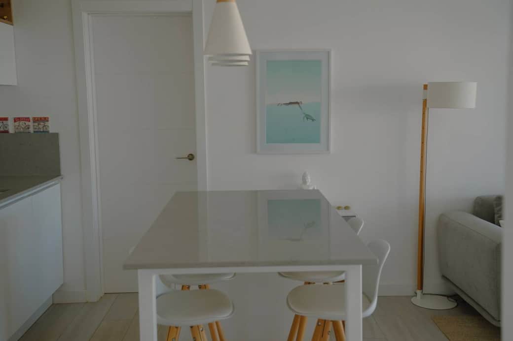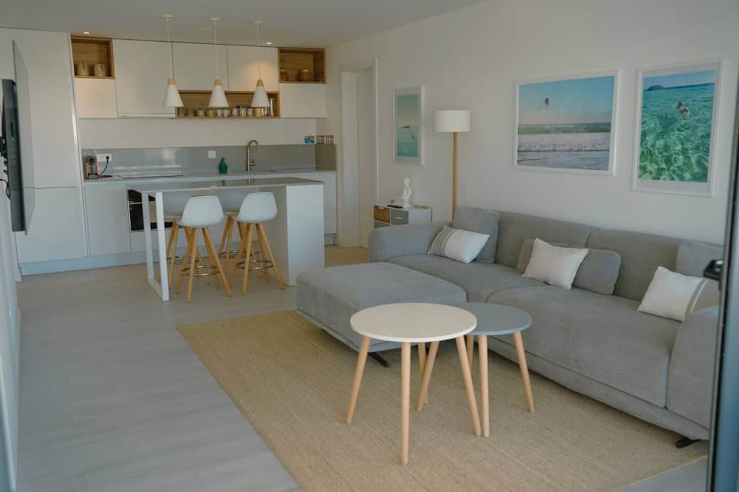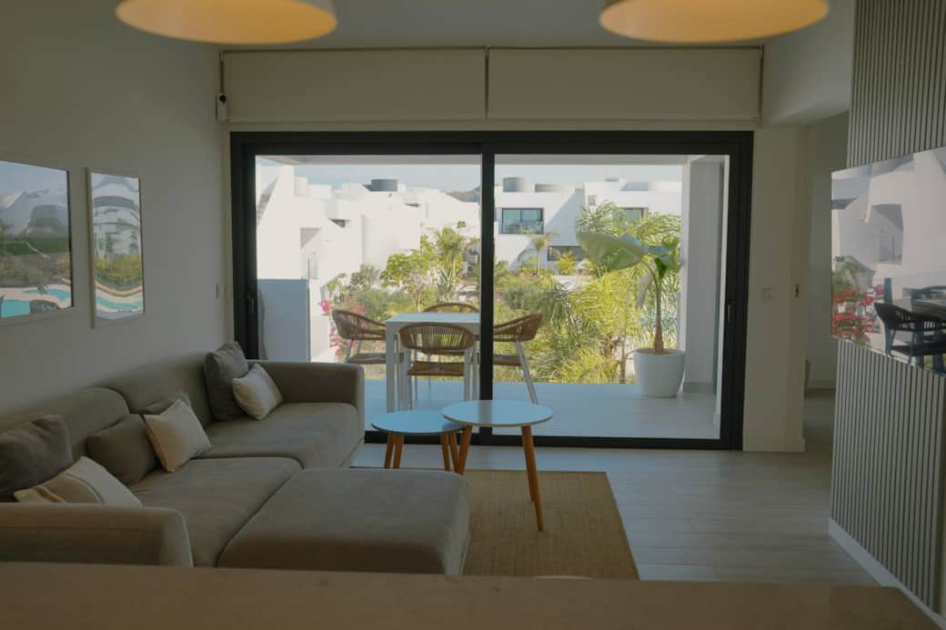 Luminoso y acogedor, con tonos suaves y decoración natural, te envuelve en un ambiente vacacional desde el primer momento. El pasillo, decorado con arte local, conduce a una cocina totalmente equipada y a un amplio salón con gran sofá y zona de entretenimiento. Las amplias ventanas se abren a un balcón soleado con vistas a los jardines y piscinas comunitarias, ideal para relajarse a cualquier hora del día.