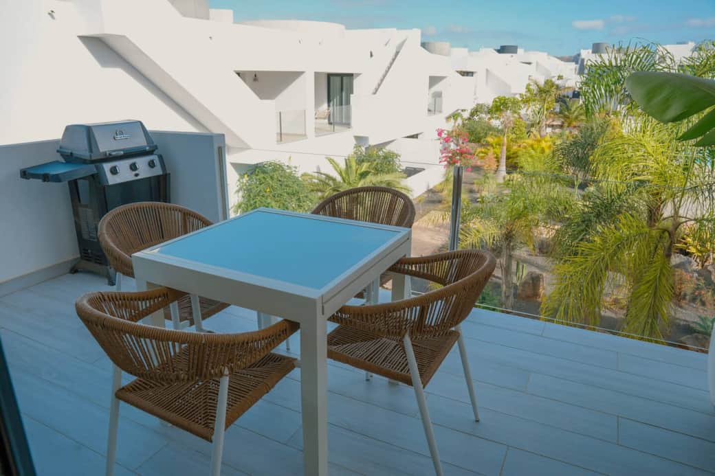 El dormitorio principal cuenta con una cómoda cama doble, mientras que el segundo dormitorio ofrece dos camas individuales, dos escritorios y acceso a un balcón orientado al oeste con preciosas vistas al valle y a la costa de Cotillo.